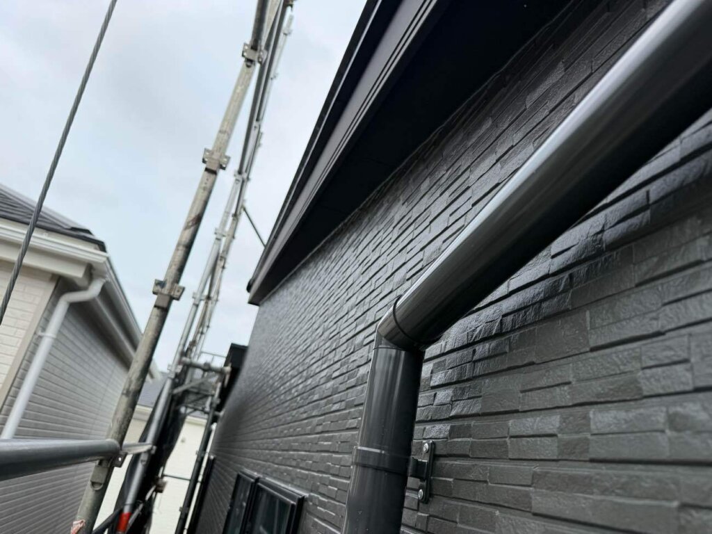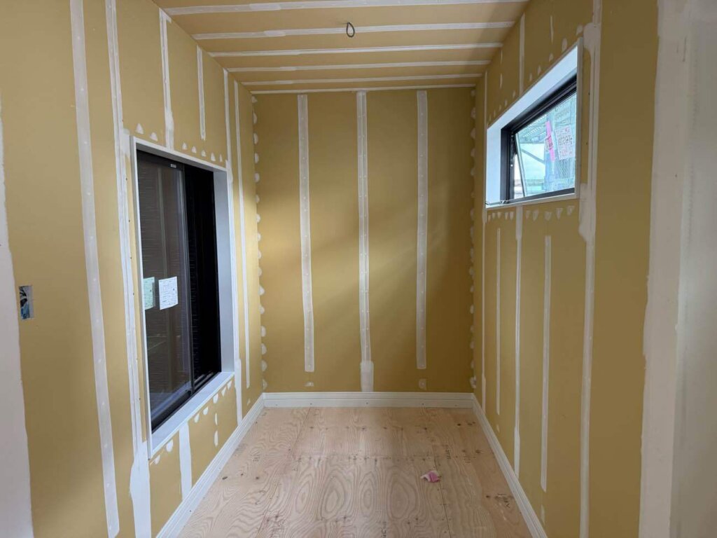 厚木市 T様邸(注文住宅) 2025年10月16日 NEW カテゴリー / atugishi 木工事が完了し、クロス工事のパテ打ちとなりました。 外部工事は塗装工事と雨樋工事が完了しシャッターボックスを取付し 足場解体となります。