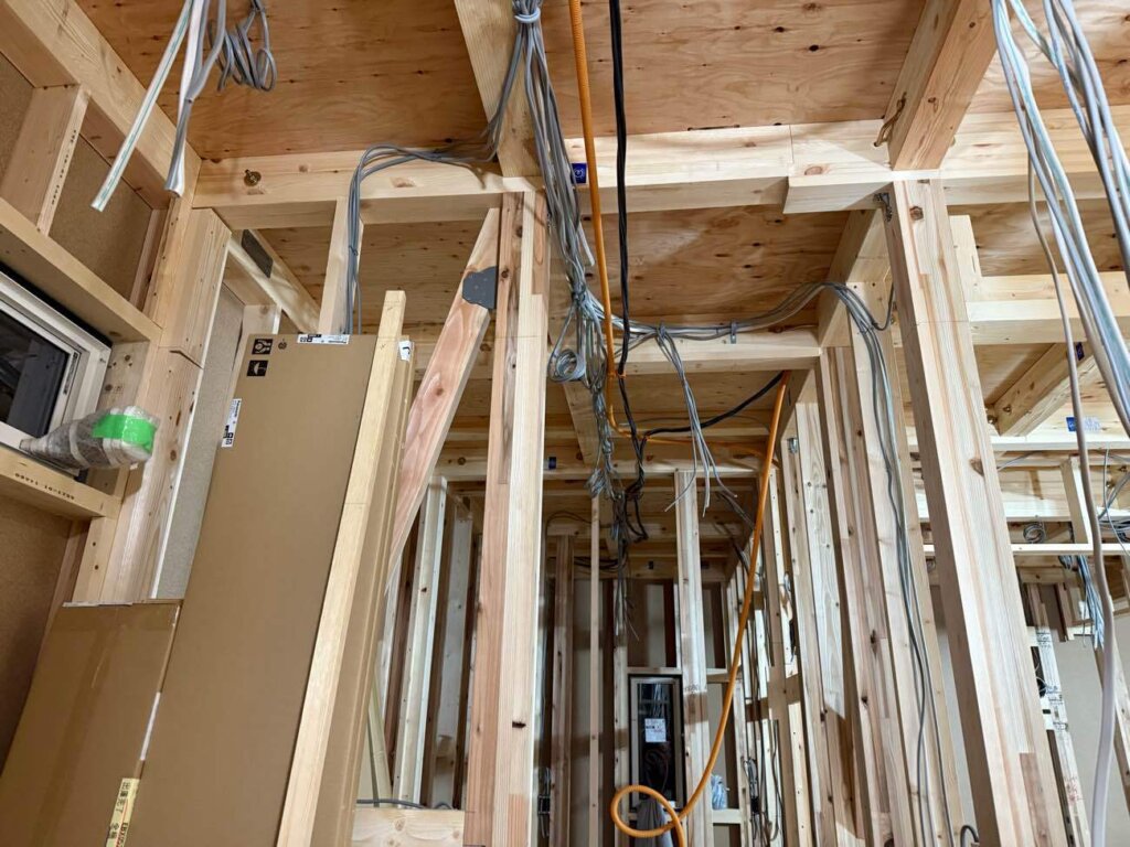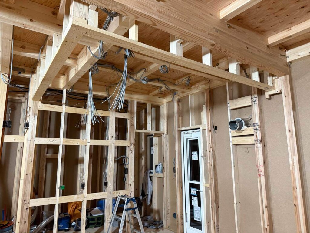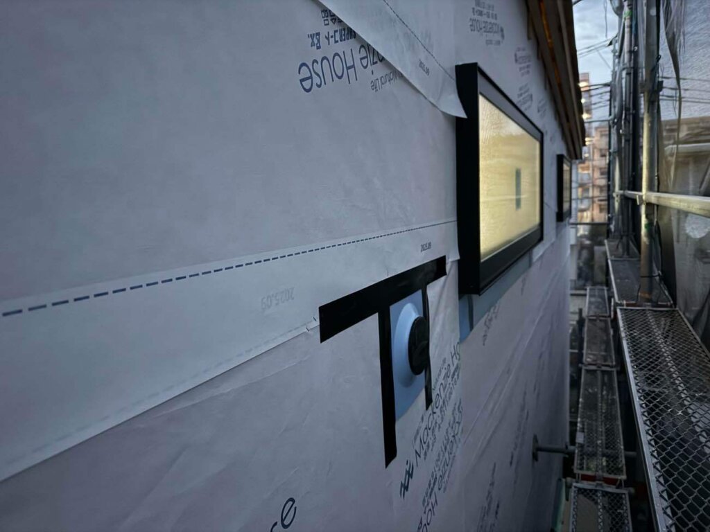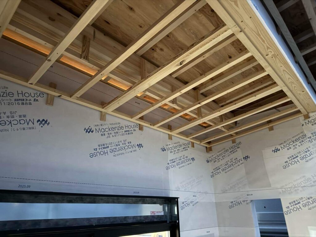 透水防水紙張りが終わり、貫通部処理、軒天下地工事と外部工事が進んでおります。