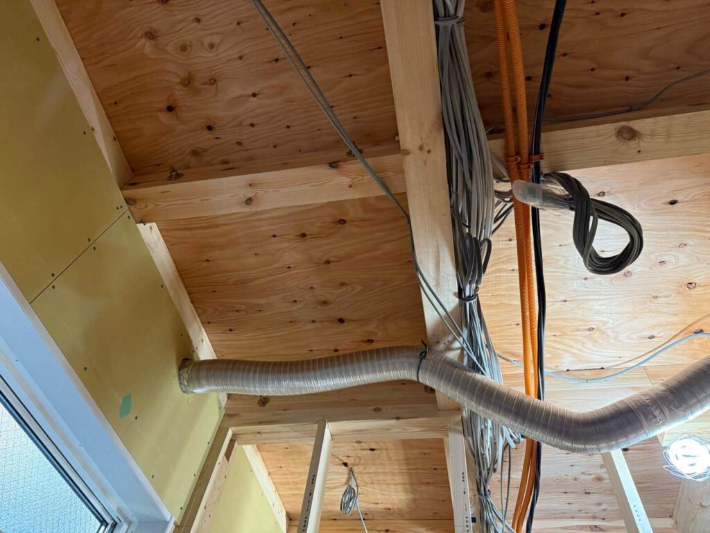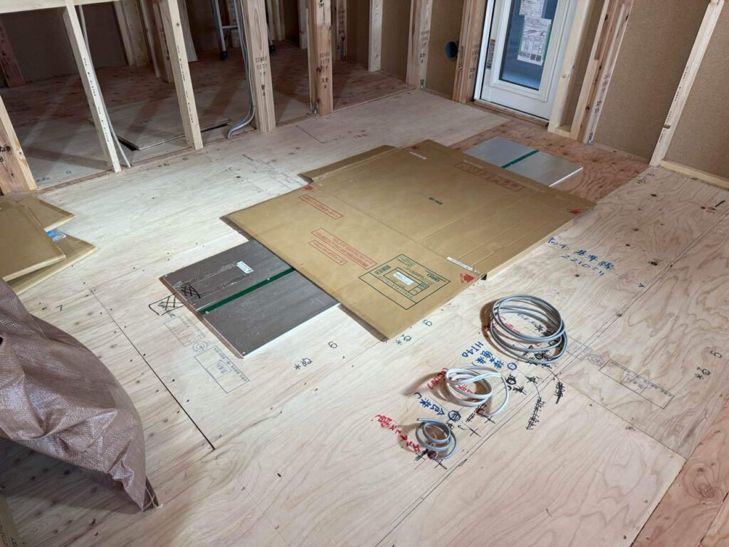 貫通部処理、電気配線工事、床暖房工事と順調に進んでおります。