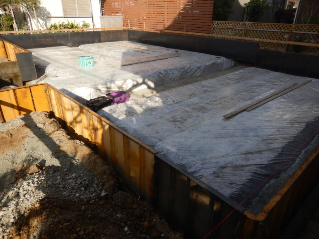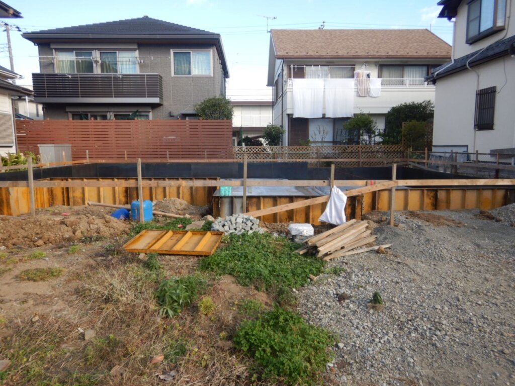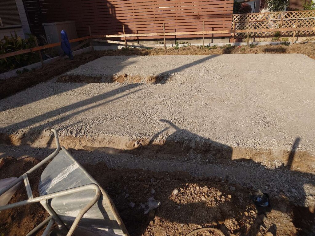 基礎着工、遣り方、床掘り、砕石、防湿シート、捨コン、枠入れ施工状況になります。