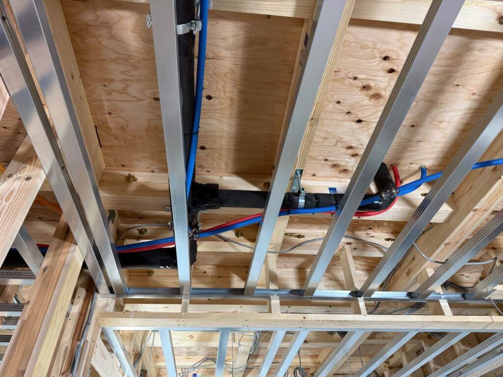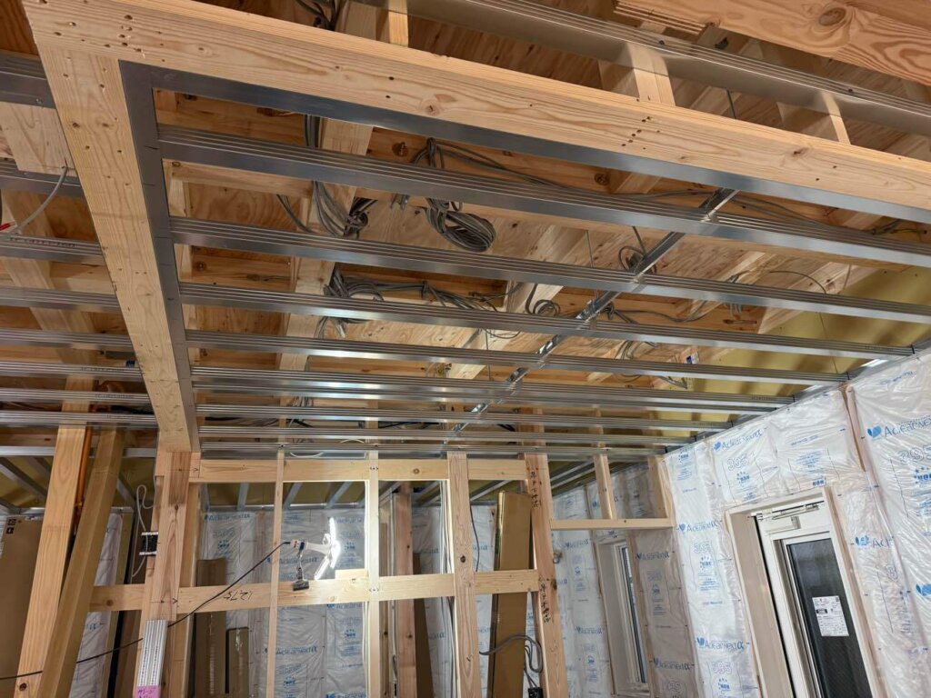 内部工事は軽天組み、内部配管~断熱材施工、外部工事はサイディング張りが