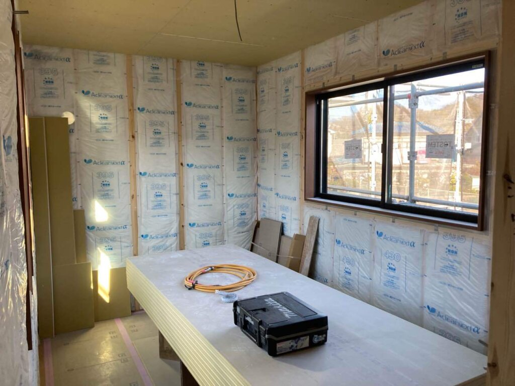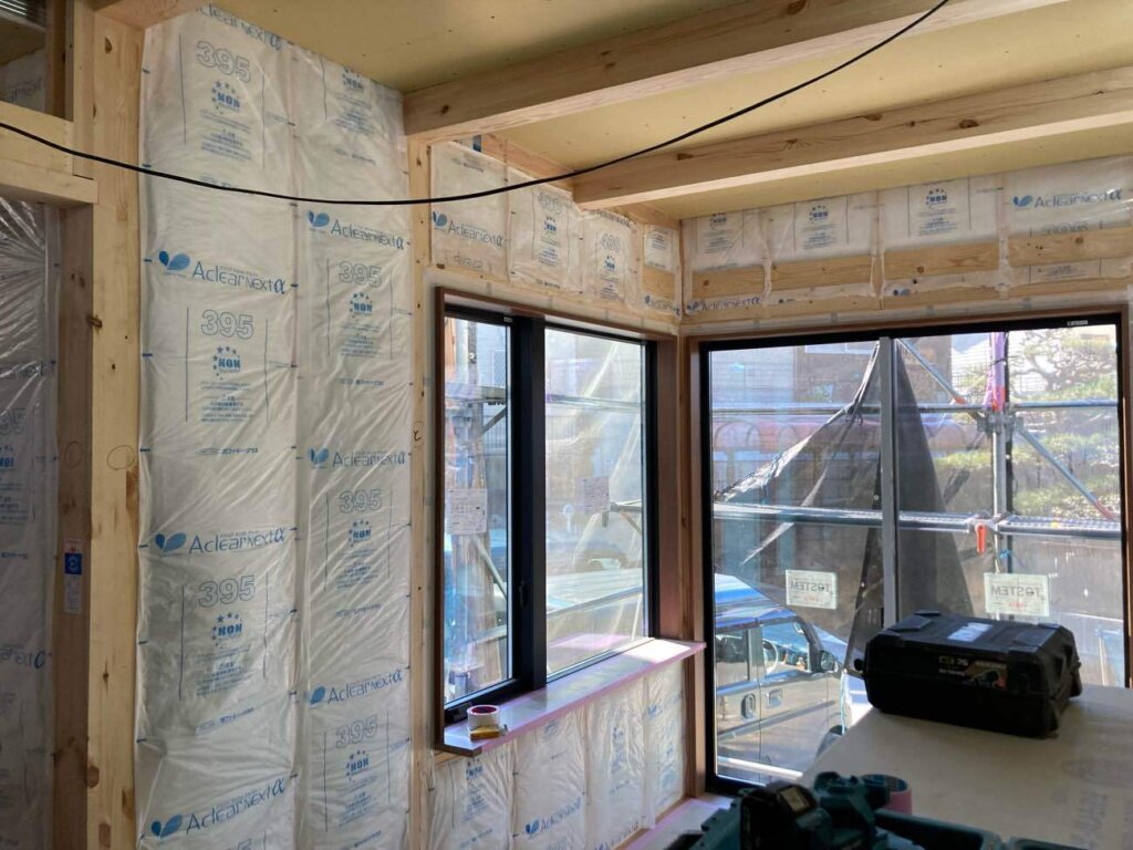 内部断熱材の施工が完了しました。これからフロアー・石膏ボード貼りを進めていきます。
