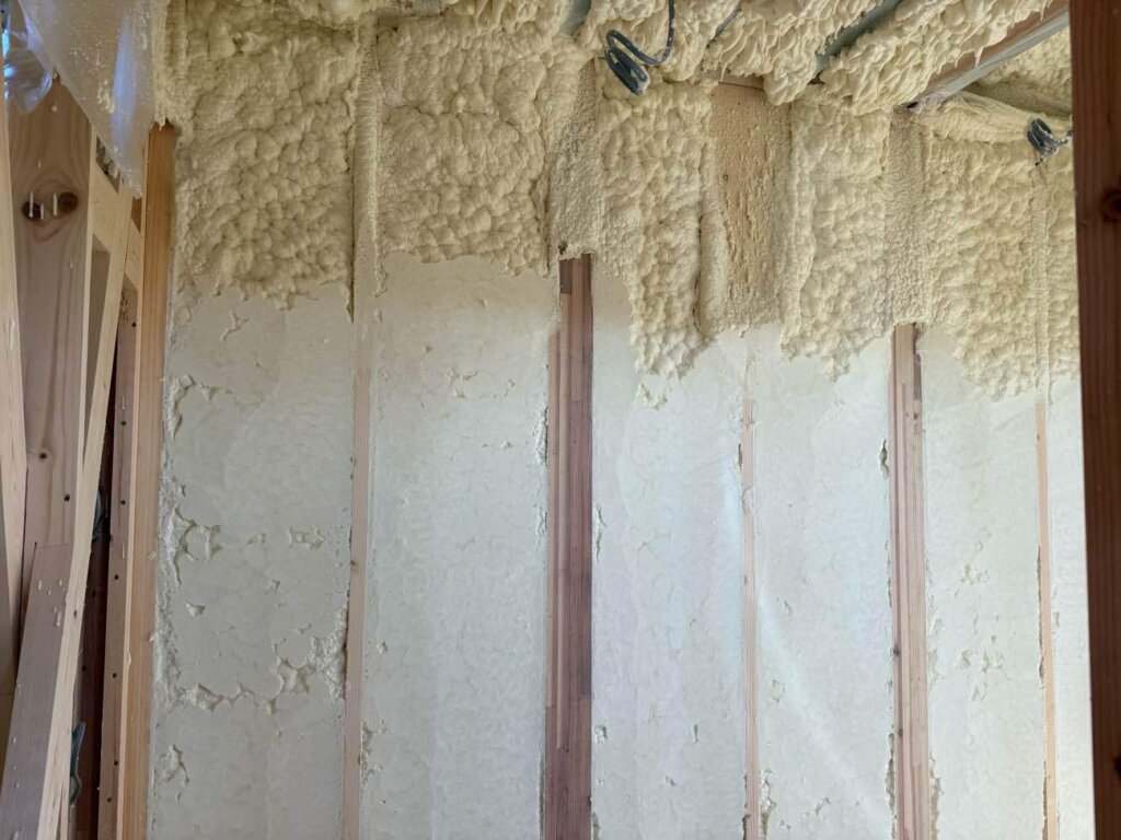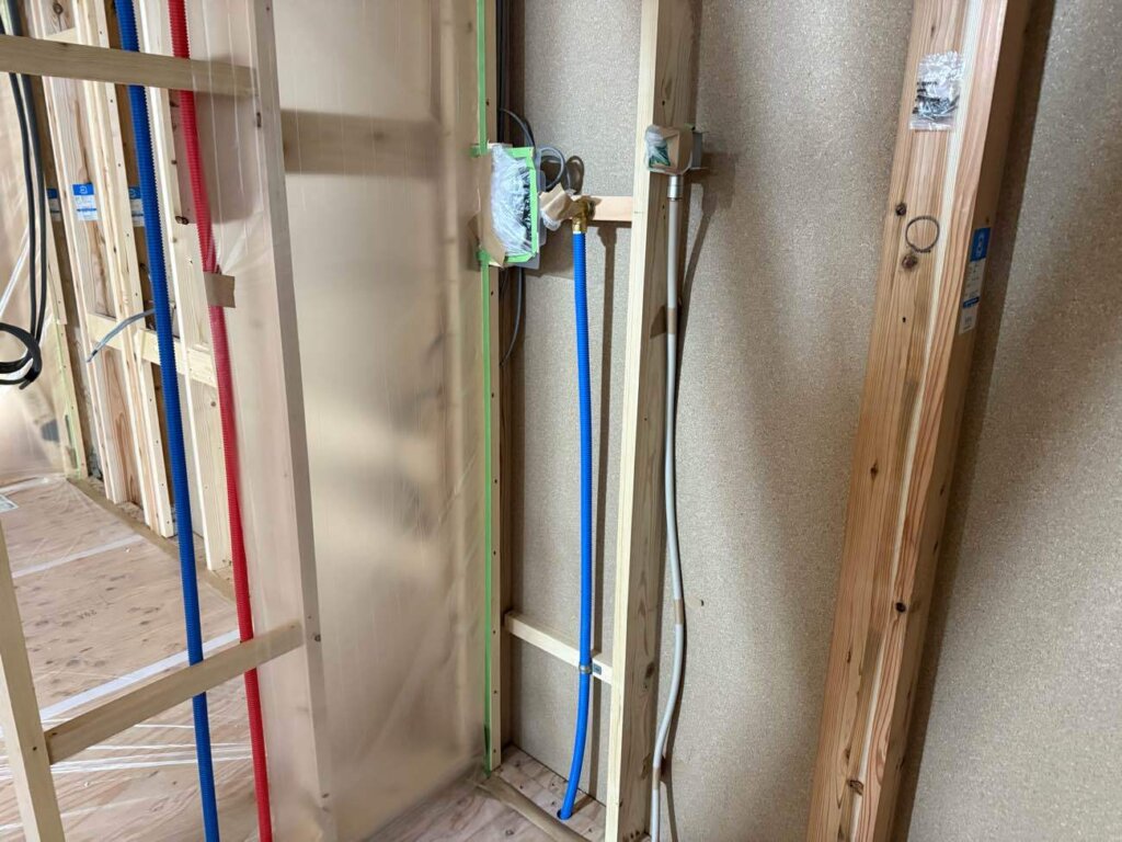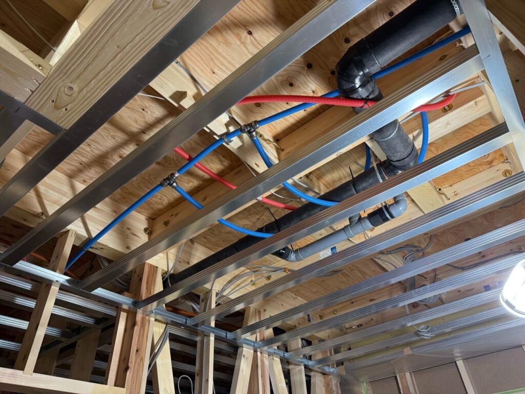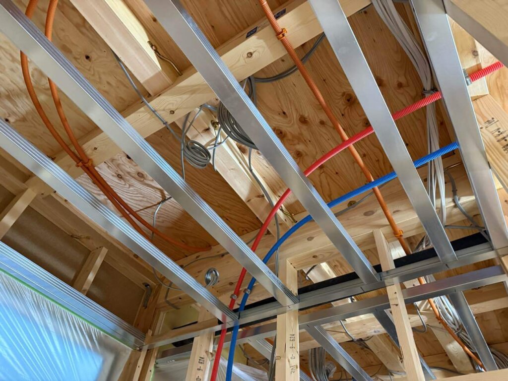 電気配線、設備配管し吹付断熱施工中です。