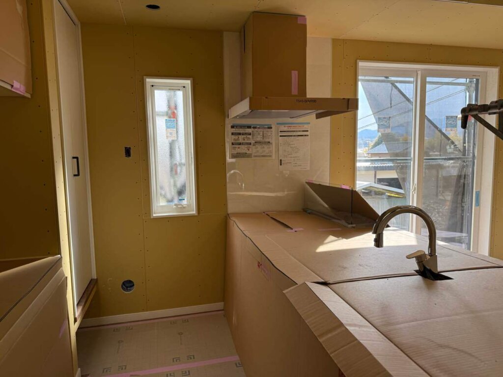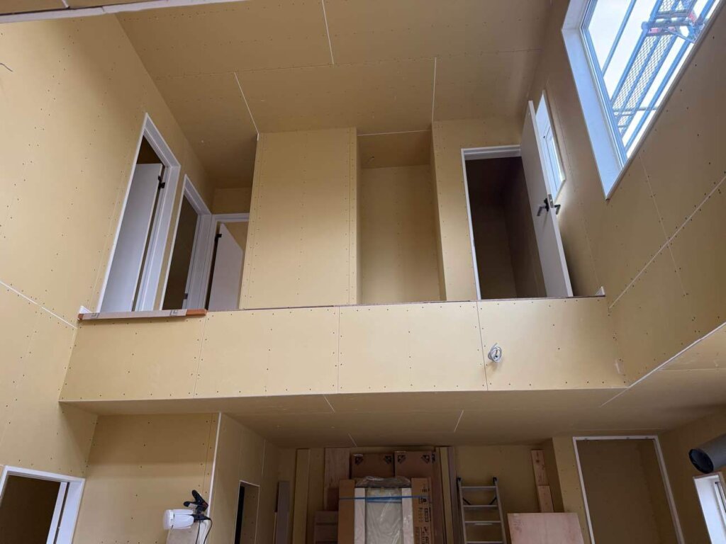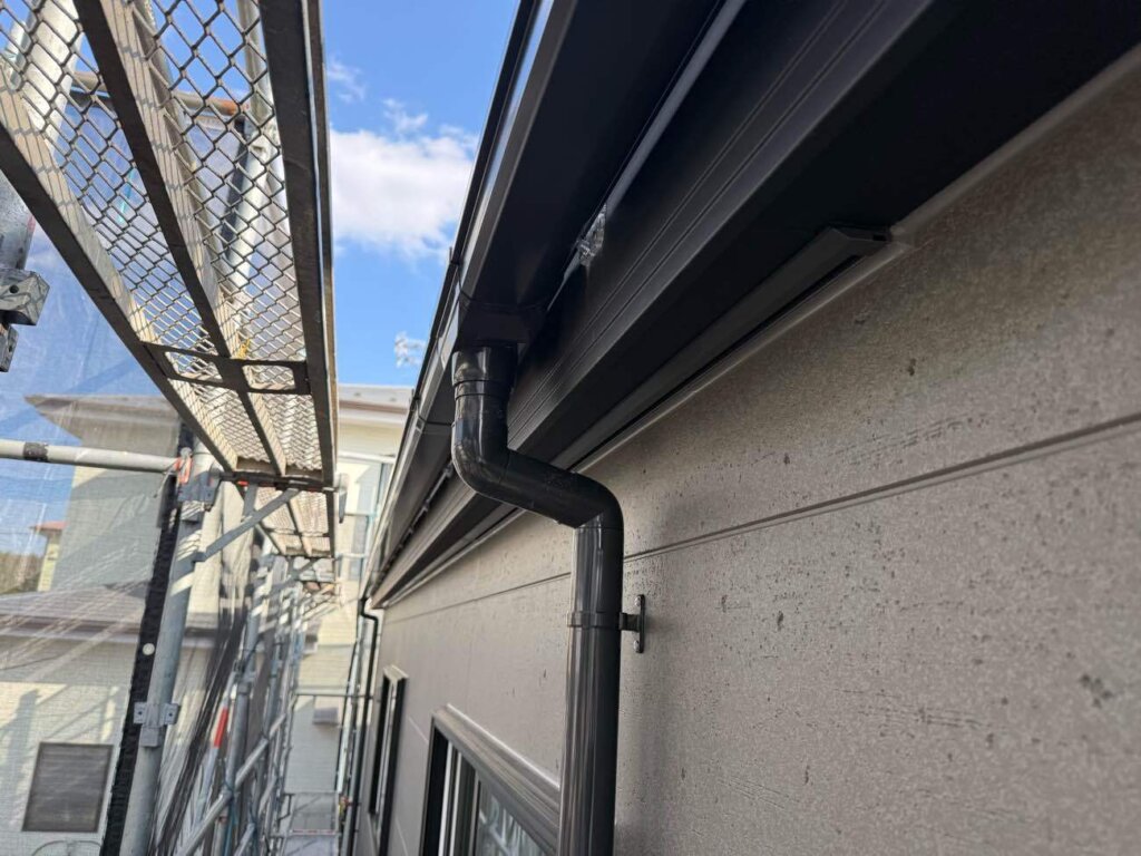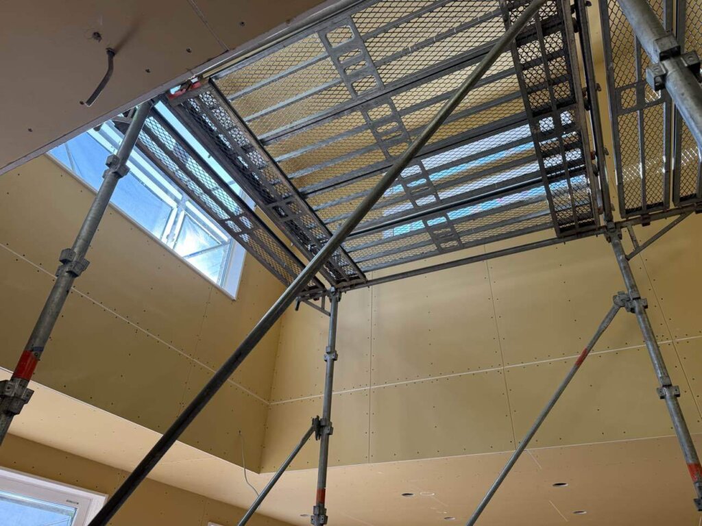厚木市 M様邸(注文住宅) 2026年3月12日 NEW カテゴリー / atugishi 木工事がほぼ完了し、吹抜けに足場を組みました。 外部は塗装工事、雨樋工事が完了しましたので足場解体になります。