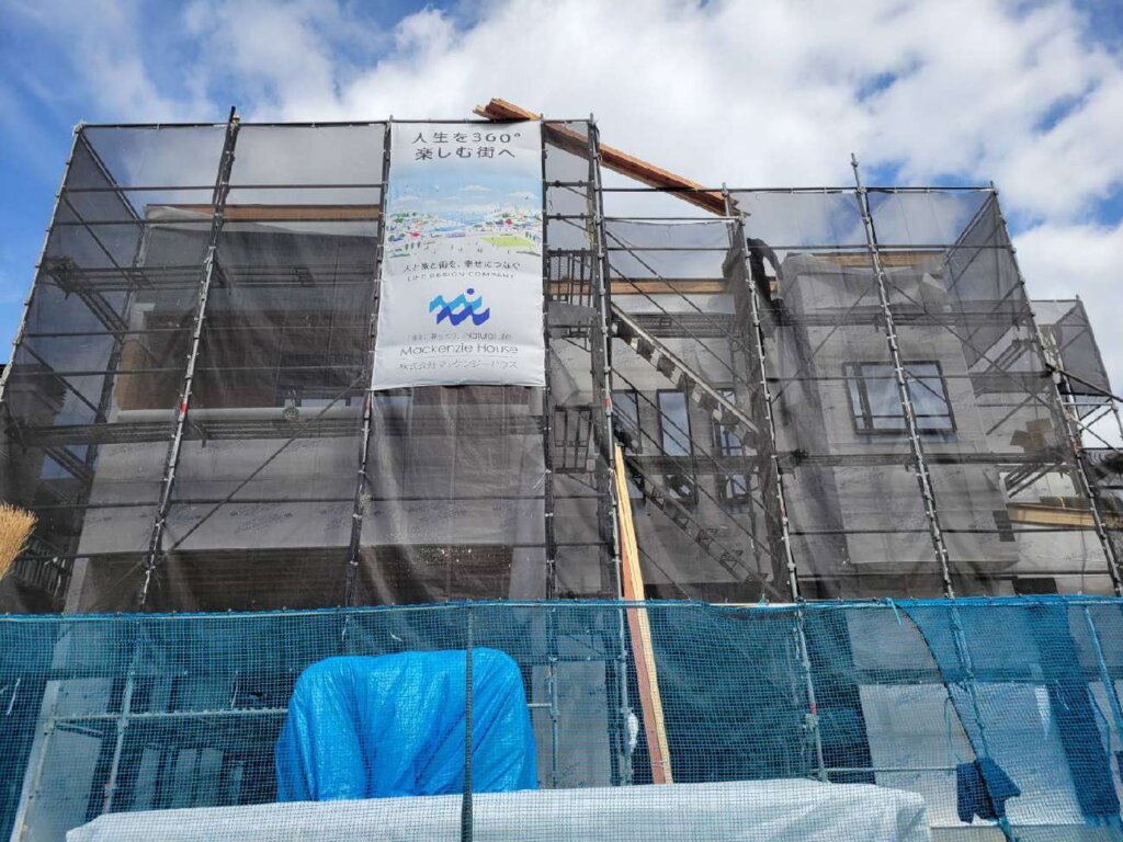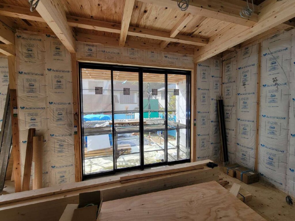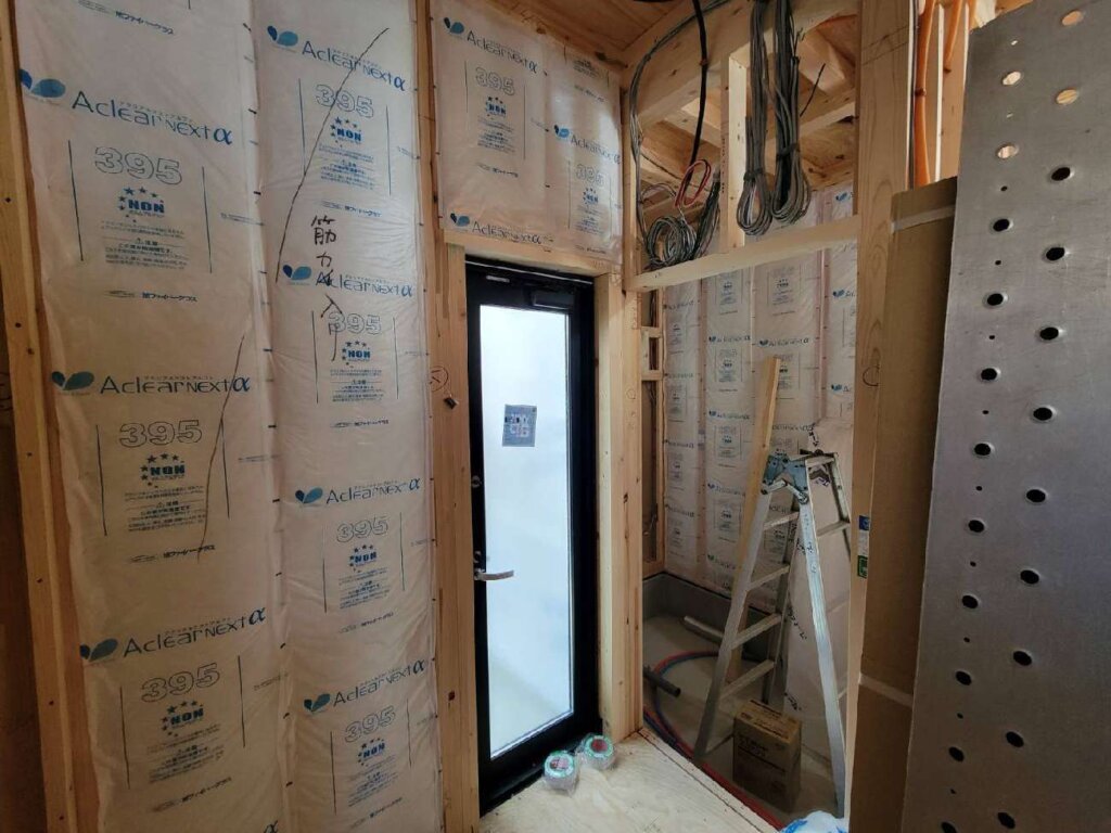 外部防水紙張り、内部断熱材施工状況になります。