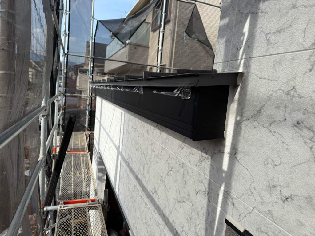 塗装工事、キッチン取付完了し、雨樋の施工中です。 次工程は足場解体しクロス工事になります。