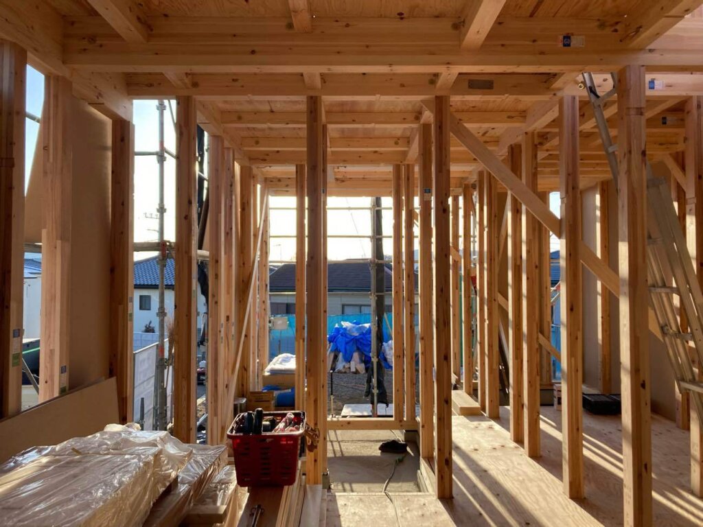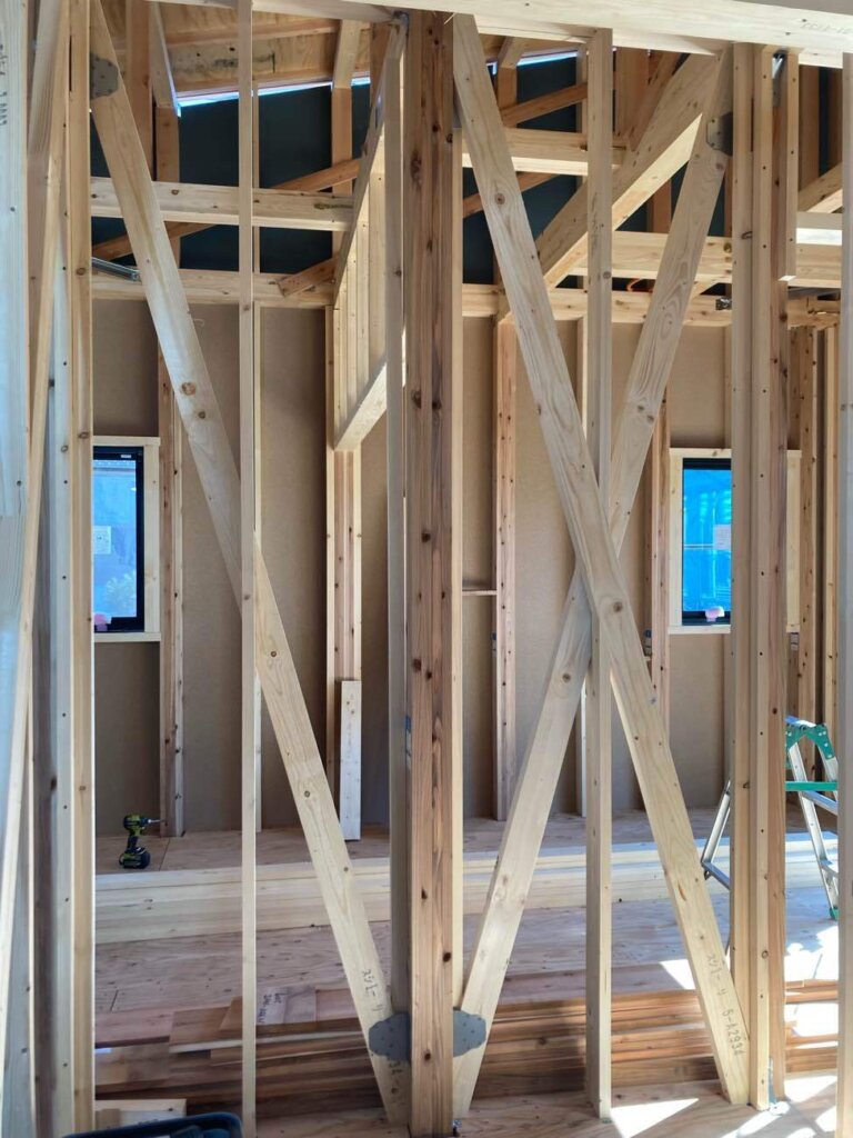 先日上棟し金物取付・下地入れ等を行っております。これからサッシ取り付けになります。
