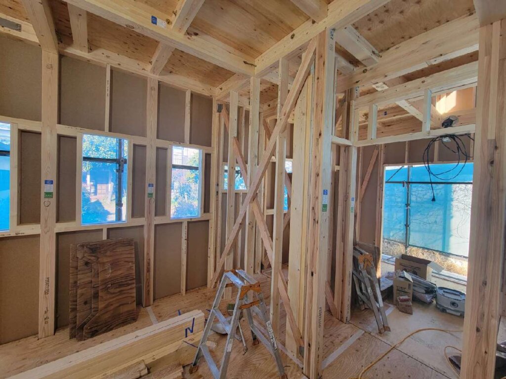 サッシの取り付けや間仕切り下地、補強下地の取り付け状況になります。 少しずつ形になっていきますね! 引き続きよろしくお願いいたします。
