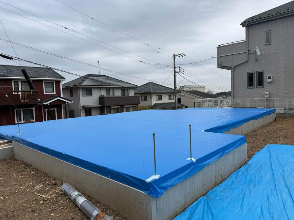 土台設置し雨養生まで進み、いよいよ上棟になります。