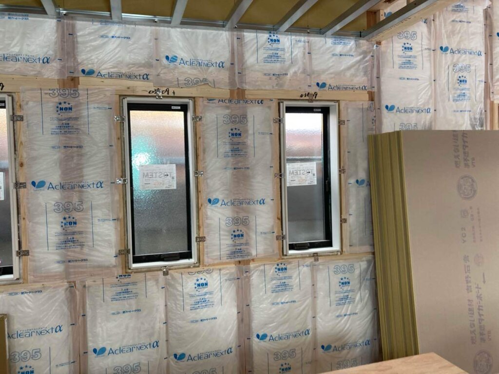 内部の断熱工事が完了しフロアー貼り・石膏ボード貼りを行ってます。