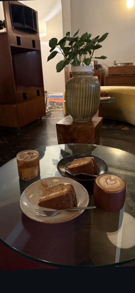 木・陶器・ファブリックが織りなすやわらかな素材感に、印象的な家具やアートをアクセントにした店内は、まさにその好例。光や家具の配置で落ち着きを感じられるシーンや、コーヒーやケーキが加わることで「時間を楽しむ場」として心地よさが引き立つシーンがあり、暮らしの場に置き換えても参考になる工夫がたくさんありました。