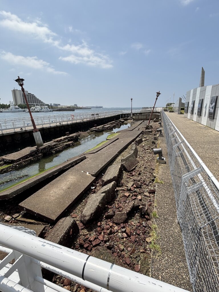 メリケンパークには、阪神淡路大震災によって被災したメリケン波止場の一部がそのままの状態で保存されていました。被災の状況や復興の過程などの記録も展示されており、