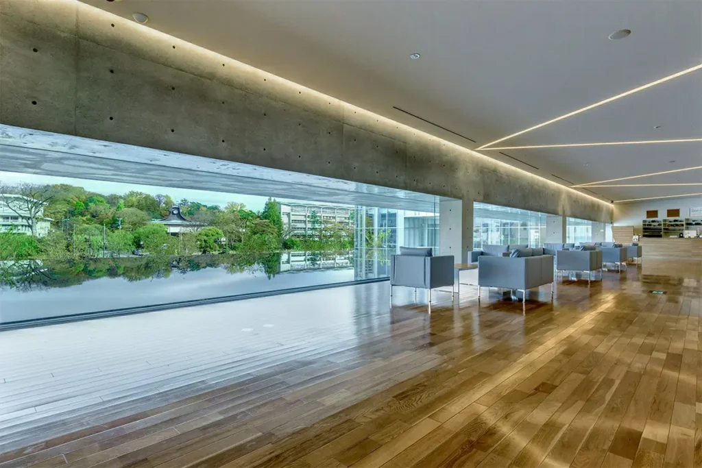 三角形をモチーフとしたデザインがいたるところにあり水庭越しに風景がみえるラウンジも美しいですね。